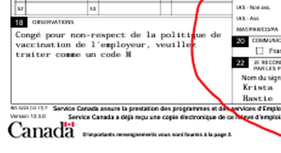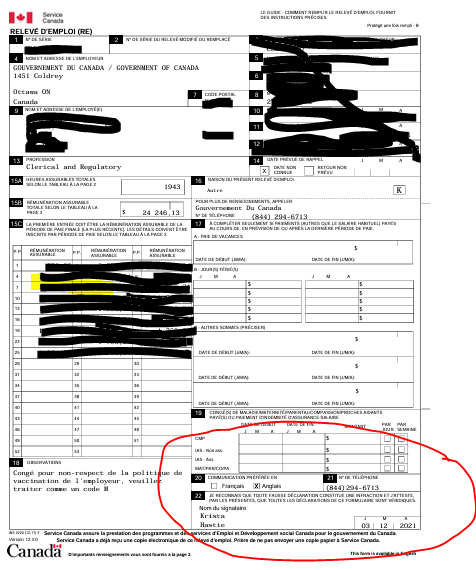 Tout fonctionnaire placé en congé sans solde pour non-conformité au mandat de vaccination peut s’adresser à Service Canada pour obtenir son relevé d’emploi (l’annexe B ci-dessous explique comment).